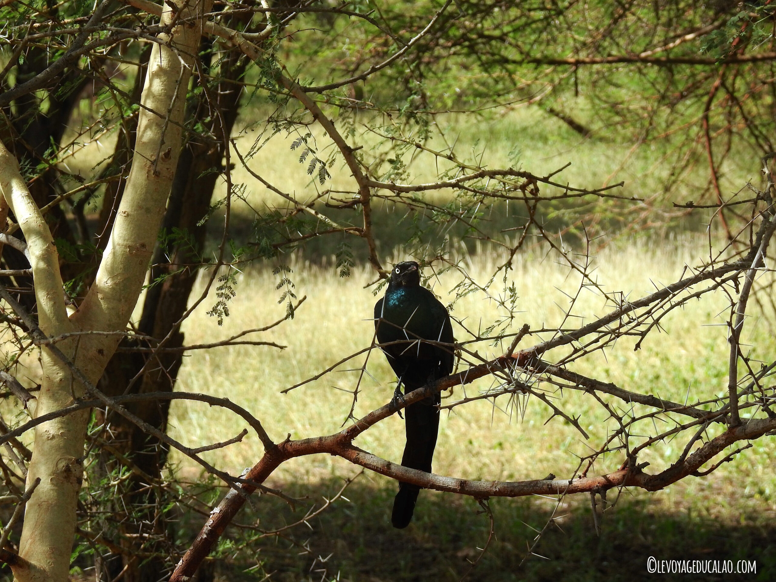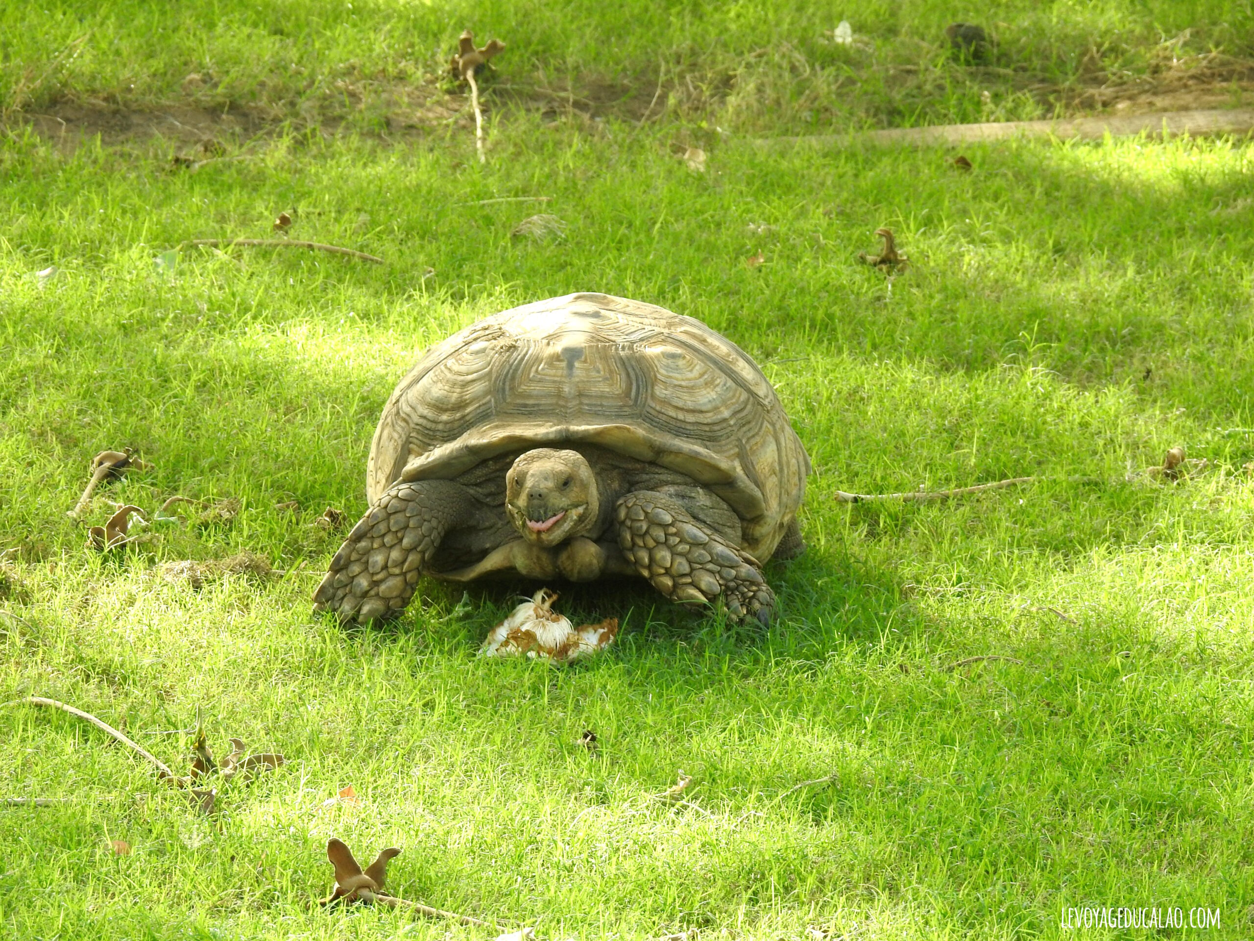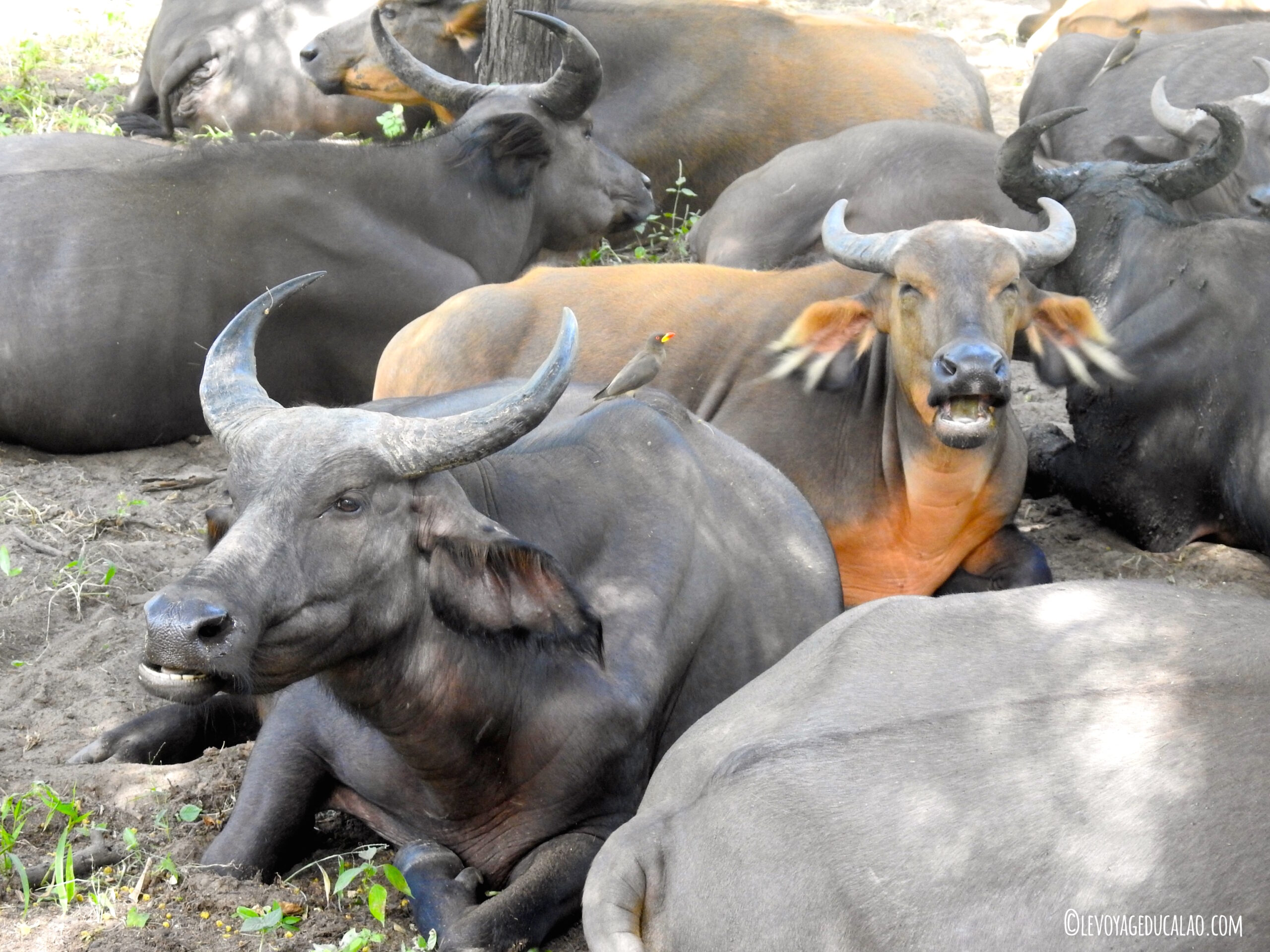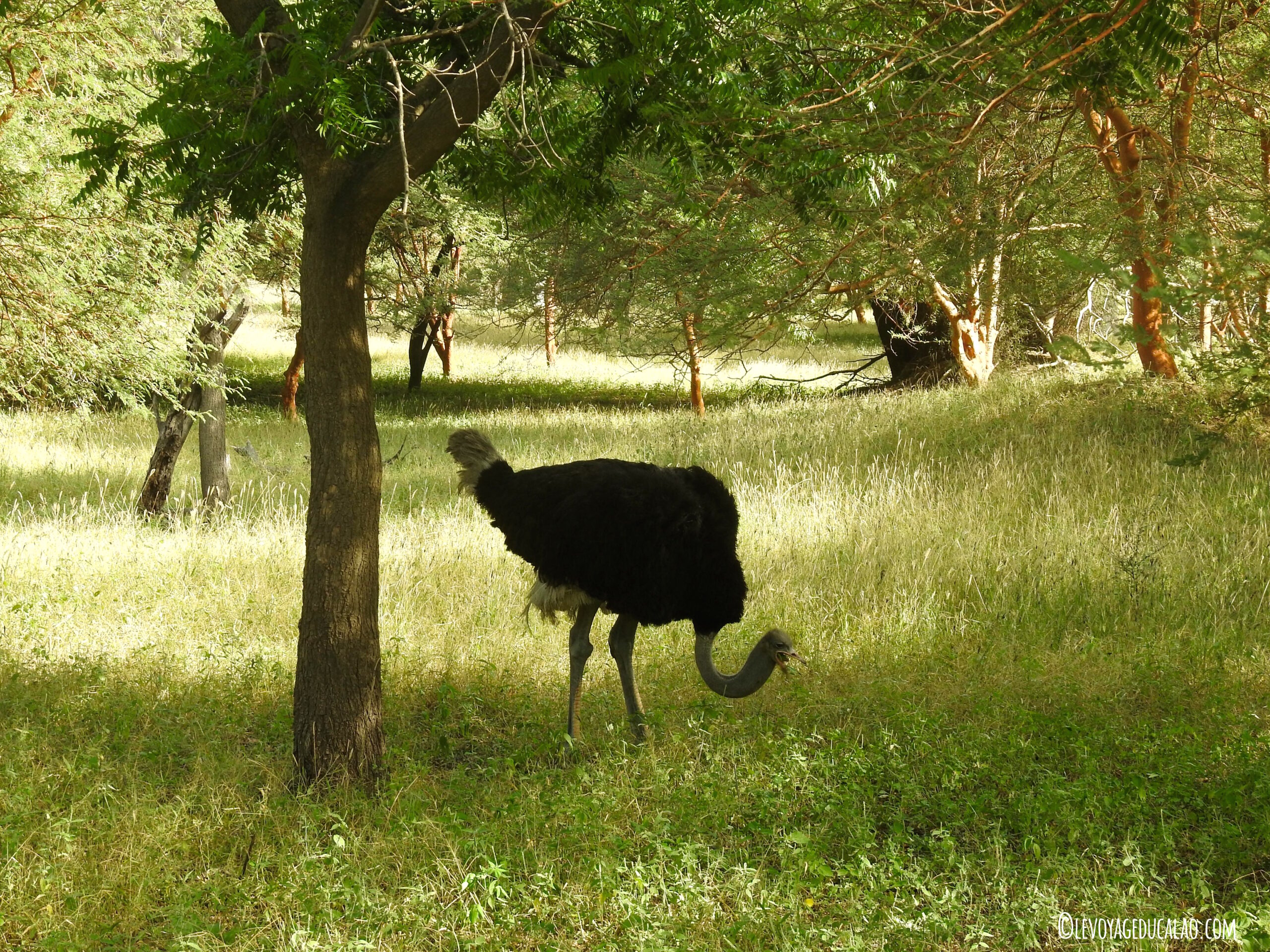 Quant aux rhinocéros, ils sont deux : 1 mâle et 1 femelle qui peuplent le parc depuis 12 ans mais n’ont malheureusement pas réussi à se reproduire. Pas d’inquiétude, votre guide saura les trouver à coup sûr. Le nôtre a fait semblant de pister leurs traces, nous faisant faire sans cesse des demi-tours, rebrousser chemin, changer de direction,… nous laissant croire que nous ne les trouverons jamais. Mais je crois que tout cela était une mise en scène et qu’il savait pertinemment où les trouver. En tout cas, ce fut un bonheur de les regarder brouter tous les deux (à 3/4 mètres de distance). Leurs cornes ont été retirées pour éviter qu’ils soient tués car même si le parc est clôturé, les braconniers arrivent toujours à leurs sinistres fins.