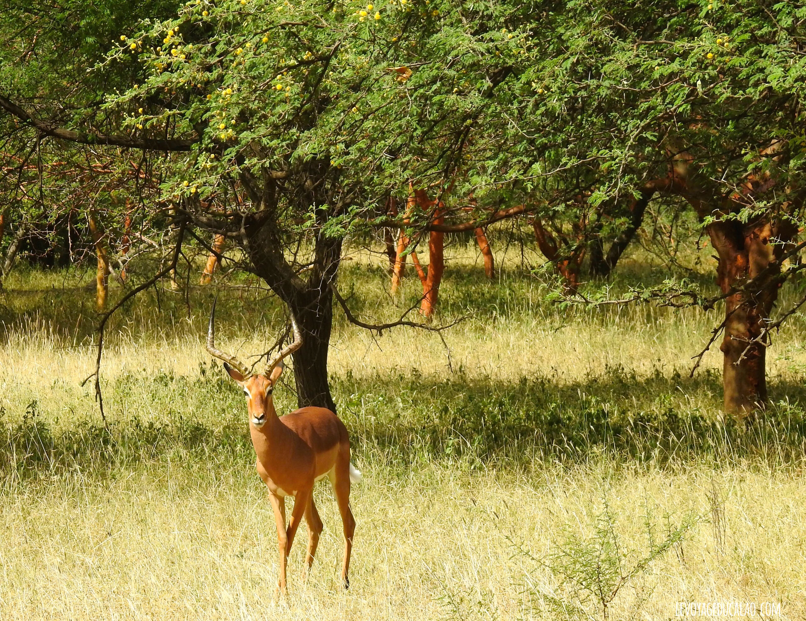 Le safari à Bandia au Sénégal n’a peut-être pas le charme du vrai safari où les animaux vivent en totale liberté, comme nous l’avons vécu à la Pendjari. Mais peu importe. La visite est bien magique. Si vous vous y rendez, vous aurez la chance d’observer de nombreuses antilopes (hippotragues, impalas sautillantes, hippotragues, éland de Derby, éland du Cap, Cobes de Buffon …), des autruches, des buffles, des girafes, des phacochères, des singes patas et vervets, des tortues géantes, des zèbres et plus de 120 espèces d’oiseaux !!! Le tout évoluant dans une nature flamboyante, entre savane arboré et savane herbeuse.