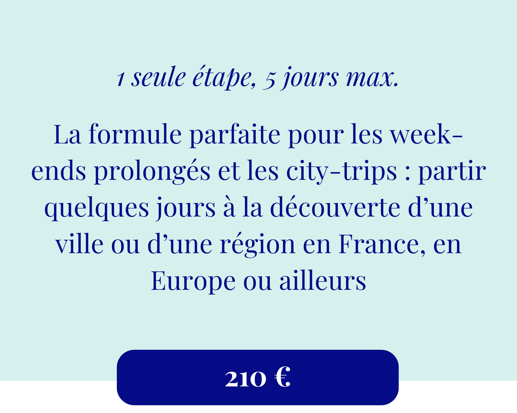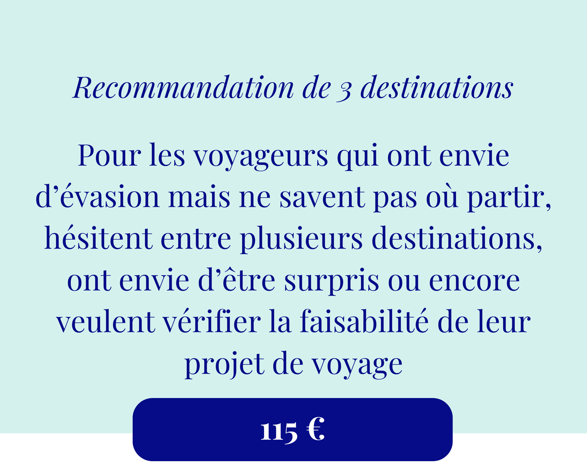 Mes tarifs s’appliquent sur une base de 5 personnes et 1 pays. Au-delà, 5€ supplémentaires par jour de voyage et par personne seront facturés et 90€ par pays supplémentaire. En option, dans le cadre des forfaits Escapade et Evasion, le Carnet de Voyage peut être imprimé au format A5 et envoyé à votre domicile pour 50€ supplémentaire. Pour rappel, un Travel Planner n’a pas le droit d’effectuer de réservation pour le compte de ses clients. Ces forfaits n’incluent donc pas la réservation des prestations touristiques ni leurs coûts.